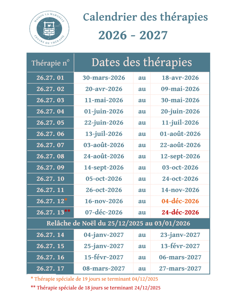 Prendre note que selon notre évaluation de votre situation, il pourrait vous être possible d’intéger la Maison la Margelle à un autre moment qu’au début d’une thérapie.